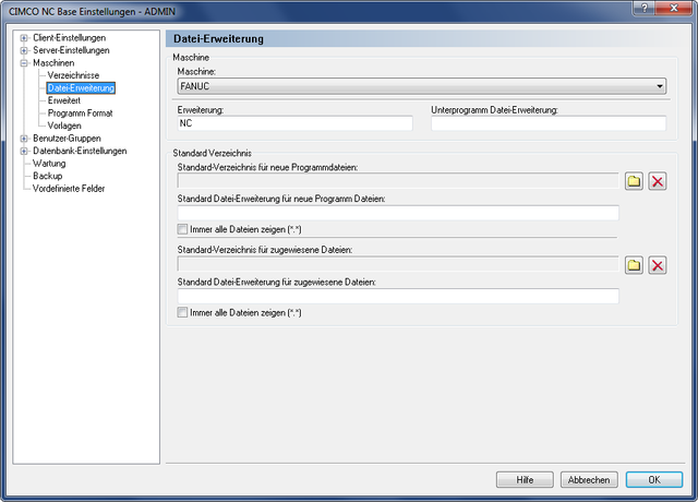 Datenbank konfigurieren. Klicken Sie dann, im linken Fenster des Dialoges 'CIMCO NC Base-Einstellungen' auf 'Maschinen / Datei-Erweiterung'. Es erscheint folgender Dialog: