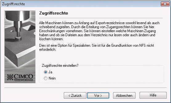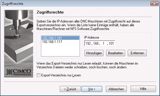 Wenn Sie das Kästchen ankreuzen, können die CNC-Maschinen lediglich Dateien vom Rechner abrufen, sie aber nicht überschreiben, löschen oder ändern. Siehe Abschnitt Zugriffsrechte um mehr über Zugriffsrechte zu erfahren.